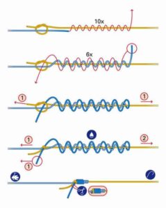 Az alábbi ábrán láthatjátok az ún. Mahin csomót, ami tökéletes megoldást ad a két zsinórfajta összekötésének problémájára. (Az ábrán a sárga zsinór jelenti a fonott és a kék a monofil zsinórt!)